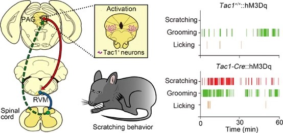 在该研究中,研究人员探究了中脑导水管周围灰质神经元在痒觉引起的抓挠行为中的活动变化,发现该脑区神经元的电活动与痒觉引起的抓挠行为有很强的相关性。进一步的研究证实中脑导水管周围灰质中存在一类表达速激肽的兴奋性神经元,杀死或抑制这群速激肽神经元能显著降低痒觉诱发的抓挠行为。相反,激活中脑导水管周围灰质速激肽神经元可以在没有外周致痒刺激的状态下诱发强烈的抓挠行为。此外,速激肽神经元促进痒觉的作用是通过调控脊髓中痒觉特异的胃泌素释放肽受体阳性神经元产生的。